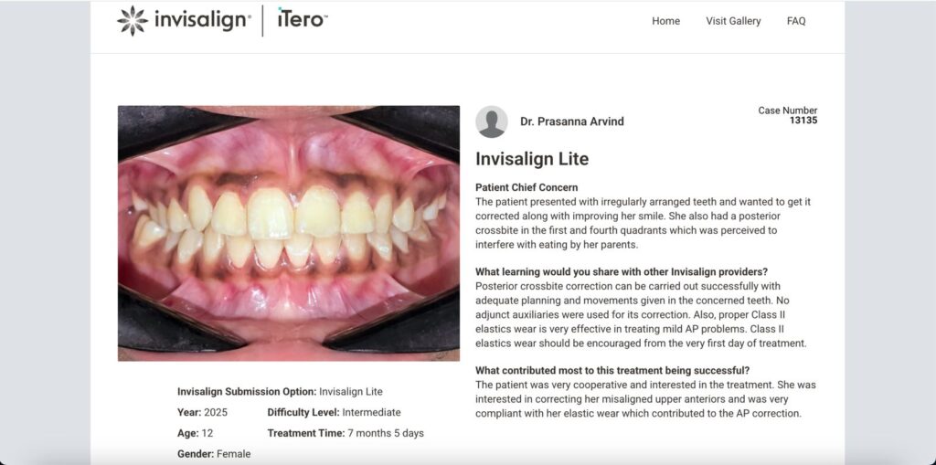 At Yaali Dental Clinic, Invisalign is not just a treatment—it is a specialized practice backed by global recognition and cutting-edge digital technology. Our Invisalign cases have been internationally featured in the Align Global Gallery™, a prestigious platform that showcases the highest quality Invisalign treatments from leading clinicians worldwide. Global Recognition in Invisalign® Align Global Gallery™ 2025 – Seoul, South Korea (KAO) One of our Invisalign cases was proudly showcased at the Align Global Gallery 2025, hosted alongside elite orthodontic treatments from across the globe. One of only 87 cases from India (all-time) The only Indian case featured in 2025 Viewed by 240,000+ orthodontic professionals worldwide This recognition reflects our commitment to precision, planning, and patient trust in every Invisalign smile we create. Powered by iTero™ 5D Element Plus Scanner To deliver world-class Invisalign outcomes, we use the iTero™ 5D Element Plus Scanner, one of the most advanced digital scanners available today. Benefits for patients: Ultra-accurate 3D digital scans No messy impressions Real-time smile simulation Faster, more predictable Invisalign results Digital precision allows us to treat even complex cases involving transverse and sagittal discrepancies with confidence.